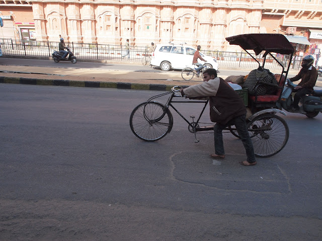 出門先到車站買車票,明天一早得前往Agra。我發現Jaipur這裡很奇怪的是,街上看不到代買車票的店家;第二個不同的是,街上多了很多人力三輪車,之前的城市看到的幾乎都是機動三輪車。